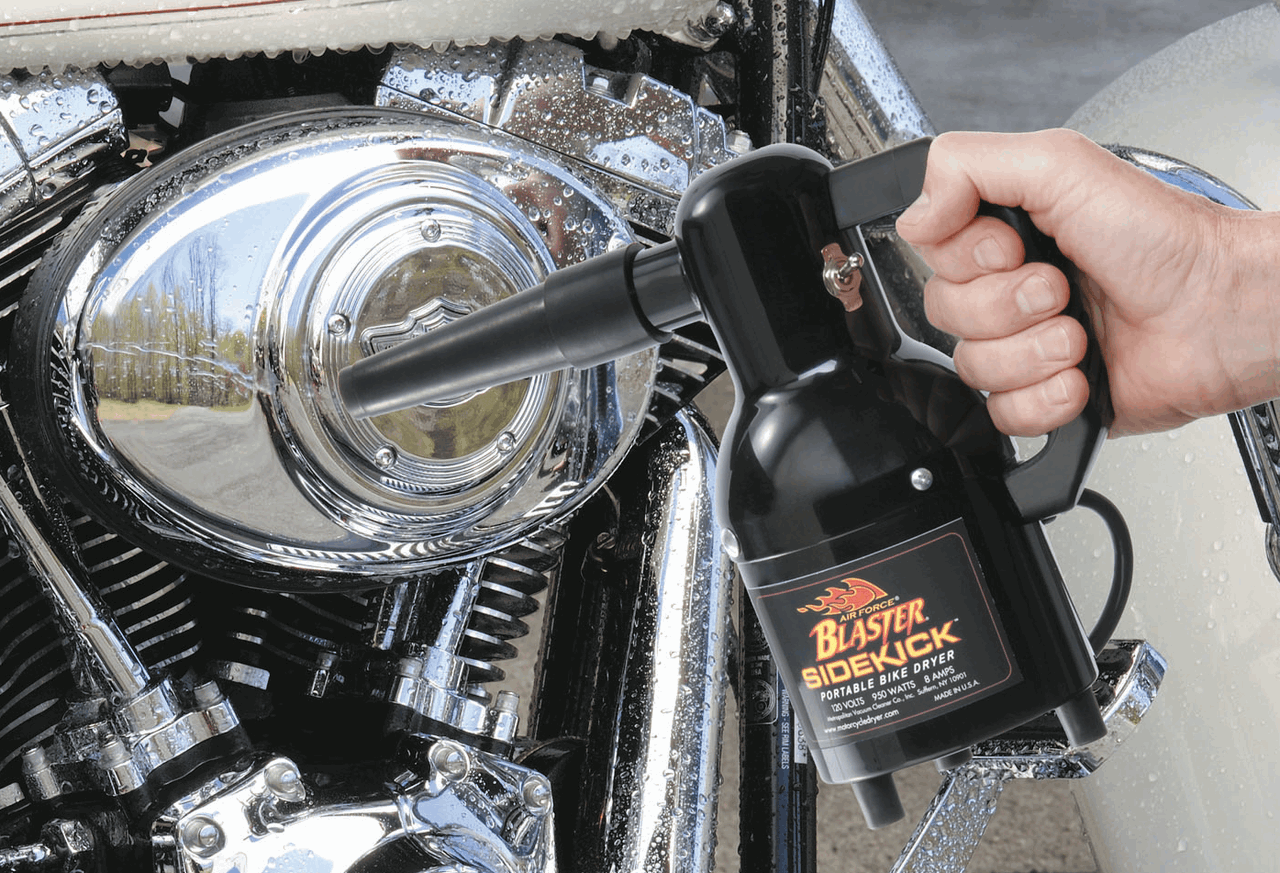Metro Air Force Blaster motorsykkeltørkere er spesielt utviklet for rengjøring og tørking av motorsykler med tørr, filtrert luft som er omtrent 20–25 grader varmere enn omgivelsestemperaturen. Air Force Blaster er den raskeste og mest effektive metoden for å tørke motorsykler grundig, og eliminerer vannflekker. Den reduserer rengjøringstiden med opptil 80 %. Fem til syv minutter er alt som trengs for å tørke en motorsykkel raskt og effektivt. Ingen flere vannflekker eller skjolder, ingen løvblåsere, ingen kompressorer – bare mer tid til å kjøre. Blasteren er helt trygg for alle typer lakk og krom. Air Force Blaster finnes i tre versjoner: en 1,5 HK SideKick, en 4,0 HK versjon for personlig bruk, og en 8,0 HK versjon for profesjonell bruk og for dem som ikke vil miste et sekund på tørking.