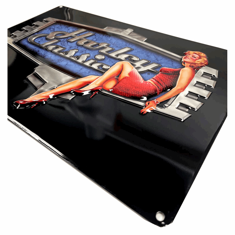 Har et tilpasset, høykvalitets grafisk design preget på metallskilt. Klassisk biker-inspirert H-D®-skrift kombinert med en retro-pinup. Detaljene på skiltet er imponerende – grafikken er litografert på tinnplate ved hjelp av en tredimensjonal prosess som gir utrolig dybde og karakter. Dette metallskiltet blir garantert et blikkfang i garasjen, verkstedet, baren, spillrommet eller hvor du måtte ønske! Perfekt gave til Harley-entusiaster. Praktiske hull for oppheng.