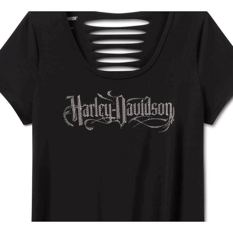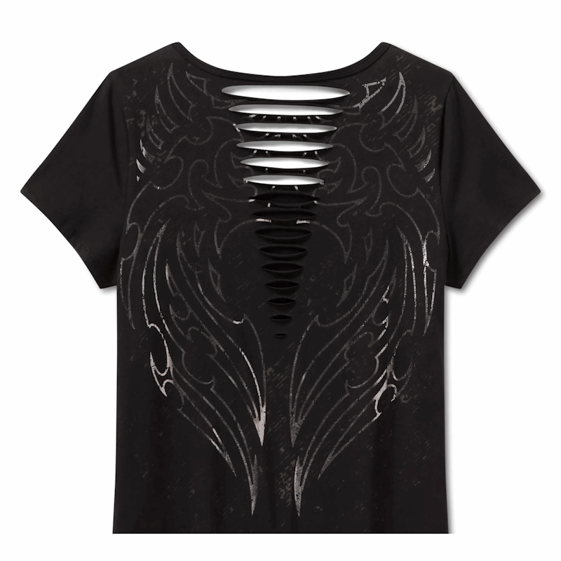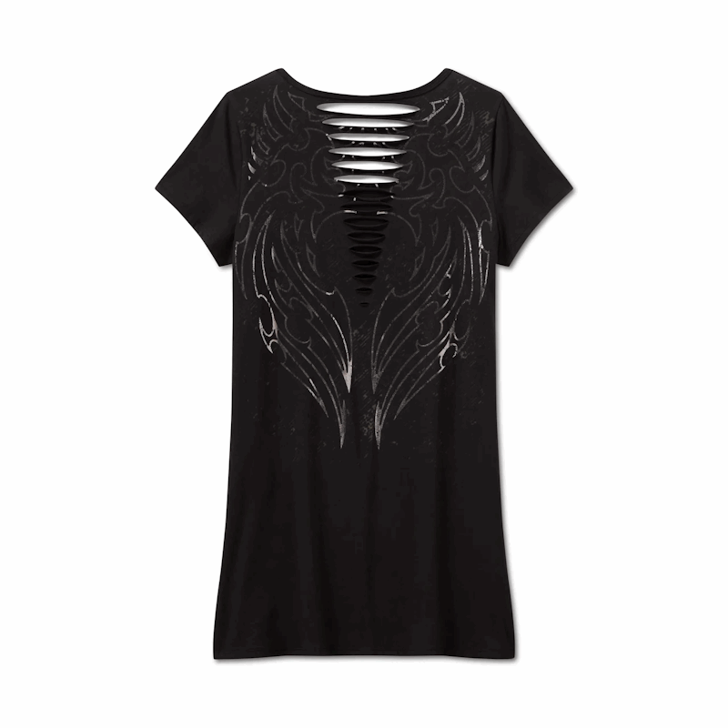 Rock din rebellstil med vår Bling Sabotage kortermede Rip & Repair tunika. Denne spesialutgaven er laget av slitesterk, pustende bomullsjersey med en touch av spandex for ekstra stretch. Tunika-silhuetten gir en allsidig og flatterende passform med detaljer som rund hals foran og en dyp rip-and-repair-rygg for et mer sofistikert uttrykk. Avsluttes med kunstverk inspirert av tatoveringsstil på både front og rygg, intrikat dekorert med rhinsteiner. Skaff deg din før lageret er tomt!