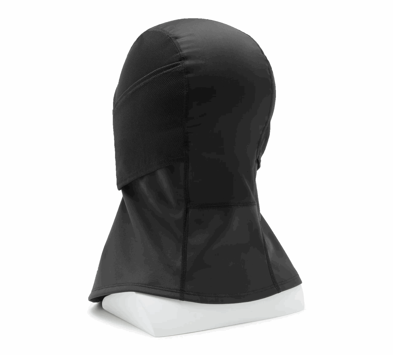 Fukttransporterende materiale i hode-/ansiktspanel og vindbeskyttende stoff i halsen.