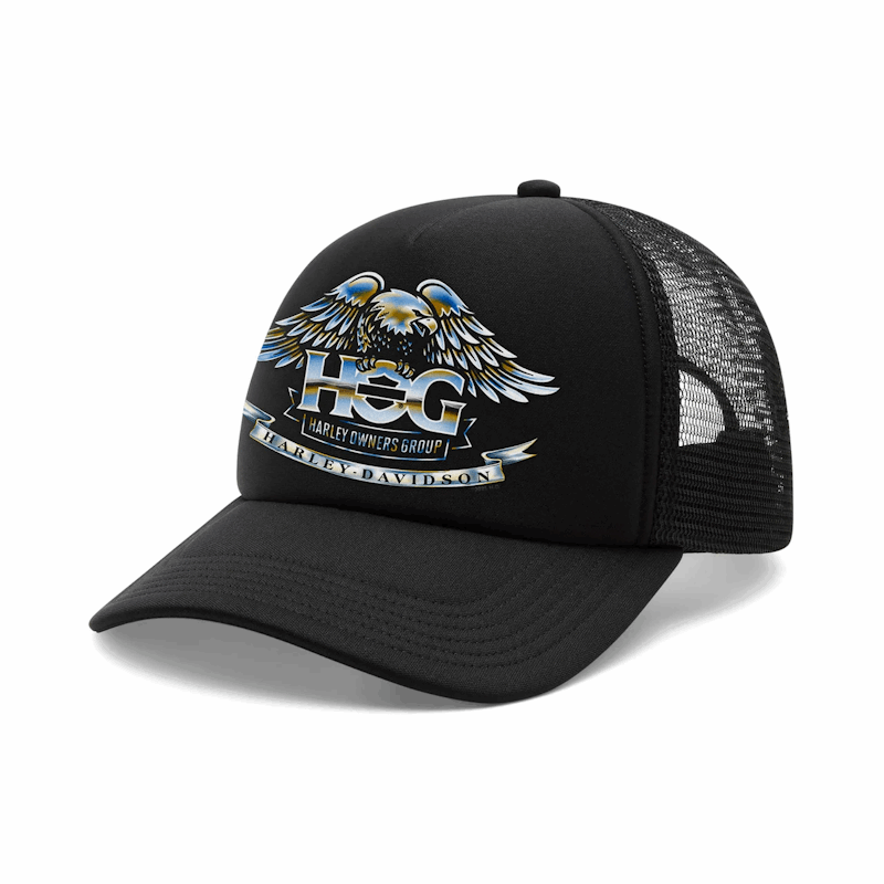 Hyll den kromelskende friheten i hver tur med vår Electric Eagle H.O.G.® Trucker Cap. Denne capsen for menn er laget med justerbar snapback for perfekt passform. Tro mot den klassiske trucker-stilen har den mesh-bakside for luftig ventilasjon som holder deg kjølig. Våre trykte, tilpassede grafiske detaljer pryder fronten, mens en brodert Bar & Shield-logo er påført baksiden. Kjenn historien – siden oppstarten i 1983 har Harley Owners Group® (H.O.G.) vært den største motorsykkelklubben i historien, og fortsetter å engasjere, inspirere og – selvfølgelig – holde folk på veien. En del av H.O.G.-kolleksjonen – spesialklær som feirer våre mest verdifulle medlemmer i kjørefellesskapet. Skaff din hos nærmeste Harley-Davidson®-forhandler og nyt rabatterte H.O.G.-priser.