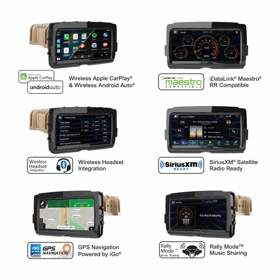 Den nyeste Soundstream-Reserve-V2 Plug-n-Play-radioen for 2014+ Harley-Davidson® Touring-motorsykler med trådløs Apple CarPlay® og trådløs Android Auto®, iDataLink® Maestro®, iGo® GPS-navigasjon, SiriusXM®, trådløs tilkobling til alle hodesett og Rally ModeTM musikksending.